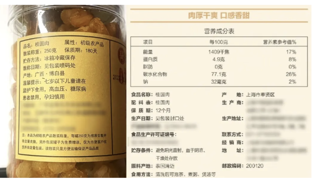 左边这盒桂圆肉的属性是初级农产品,保质期180天,就没有再标其它信息了。右边也是桂圆干,但是有产品标准代号和食品生产许可证编号,保质期也更长,也就是说这个产品做了相应的除菌,选择后者是更安全的。要注意,这个不是开袋即食,一定要清洗后再给孩子吃,如果是中性粒细胞比较低或者做了骨髓移植的孩子,做熟才能吃。