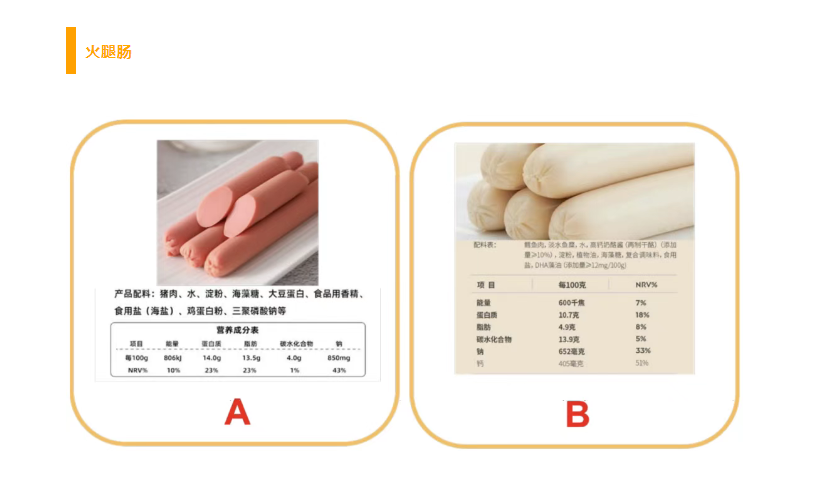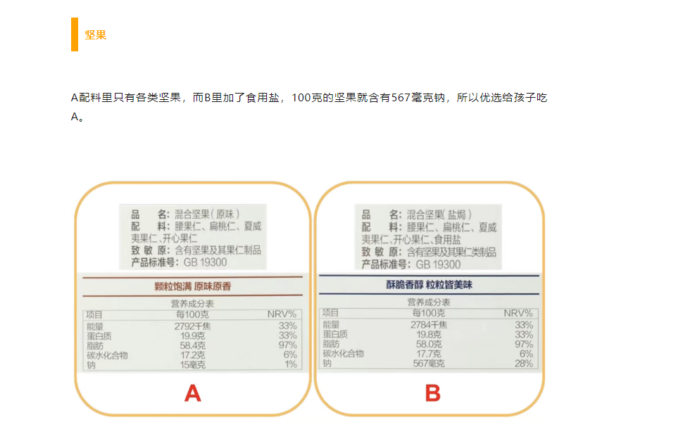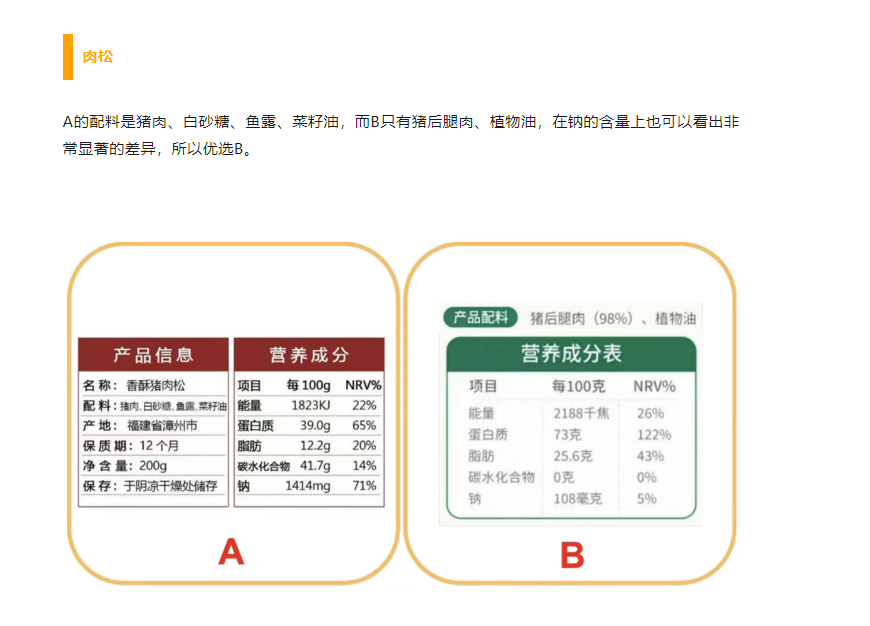 下面举几个例子教大家如何根据商品包装上的营养成分表和配料表“择优”。