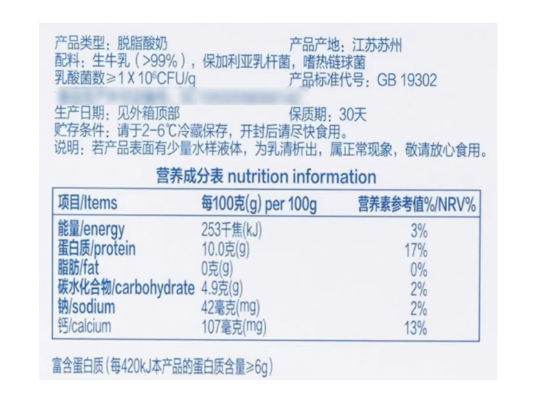 下面这张营养标签是脱脂酸奶,产品配料里只有生牛乳和两个菌种,热量比前面几种更低,对于需要低脂饮食的孩子更加合适。