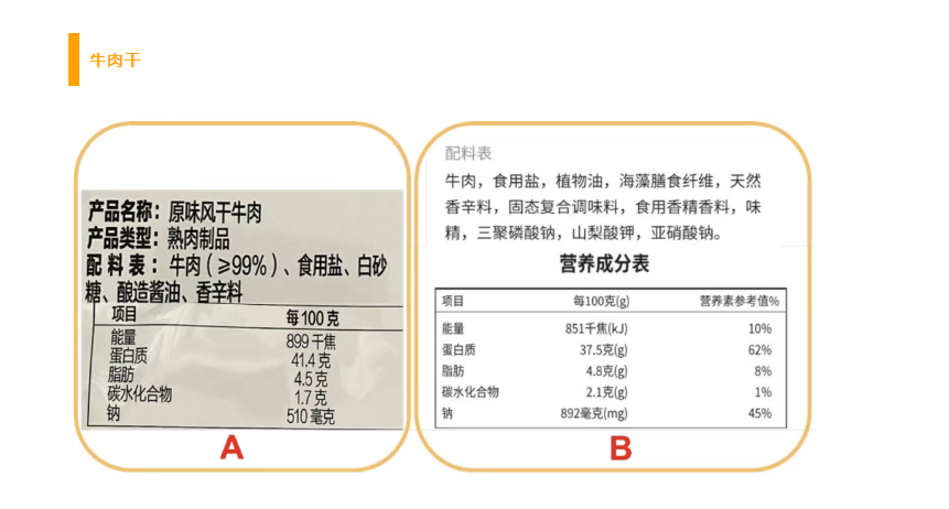 A属于熟肉制品,配料表有牛肉、食用盐、白砂糖、酿造酱油、香辛料。B的配料则要长得多。很明显,A的配料表更简单。再来看营养成分表,A的100克蛋白质有41.4克,比后者高。每100克A有510毫克的钠,而B有892毫克。所以,A是更优的选择。