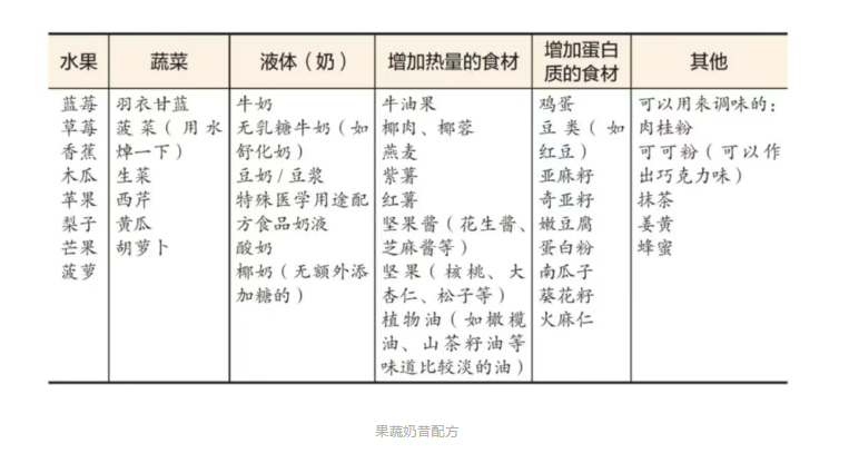 果蔬奶昔:这里提供一些配方参考,家长可以自行选配,举一反三。如果孩子喝牛奶拉肚子,就可以用无乳糖牛奶,比如舒化奶或者豆奶;如果孩子体重下降,就推荐用特殊医学用途配方食品来做液体基底;还可以加酸奶或者椰奶,辅以一些高热量的食物,比如牛油果(要注意的是,牛油果脂肪含量很高,低脂饮食期间不建议吃);还可以加一些椰蓉、燕麦、紫薯、红薯或者放一些坚果、豆类都是可以的。如果体重下降比较多,或者移植期间孩子的蛋白质需要量非常高,还可以加入蛋白粉;也可以加一些可可粉、肉桂粉等调节口味。