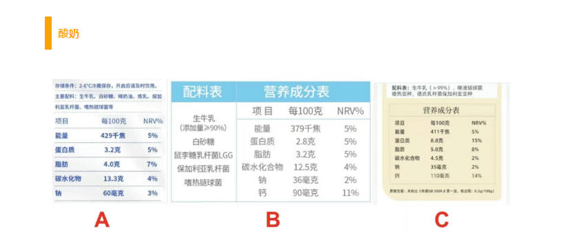 A的配料是生牛乳、白砂糖、乳清蛋白粉、菌种和各种食品添加剂。B的配料只有生牛乳、白砂糖和三个菌种,所以B的配料更干净,B是比A是更优的选择。C的配料表只有生牛乳和一些菌种,没有添加白砂糖,蛋白质的含量也比B更高,C是更健康的选择,也更适合要控制血糖的孩子。没有添加糖觉得不甜不好吃,可以加点水果补充甜味。