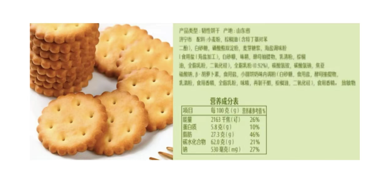 很多孩子都爱吃小饼干,饼干的配料表也比较复杂,例如下面这个小饼干的成分,有一个成分叫做棕榈油,属于饱和脂肪,孩子在治疗期间,尤其是激素用药期间很容易出现血脂异常,棕榈油、猪油、黄油这类饱和脂肪都建议少吃。而且这个小饼干100克的热量有2163千焦,钠含量也挺高的。