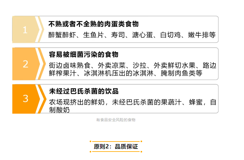 最后,避免有食品安全风险的食物,包括不全熟的肉蛋类、街边小摊的熟食凉菜、外卖的鲜切水果、鲜榨果汁、没有经过巴氏杀菌的饮品等等,可以保存下表备查。