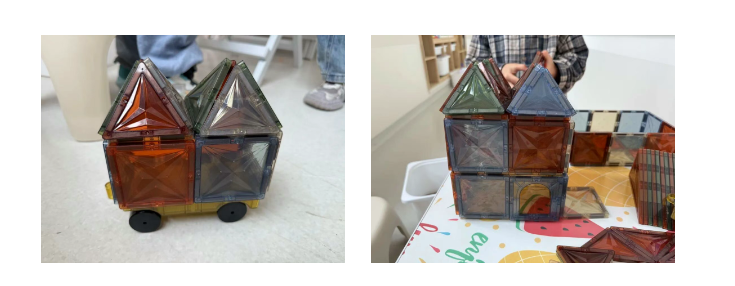 可孩子的心里,总有藏不住的光。那天,荣荣举着拼好的积木跑过来,眼睛亮晶晶地说:“姐姐你看!这是小车,这是两层楼的大房子——外面这个是蹦床,跳一下就能去二楼玩!”